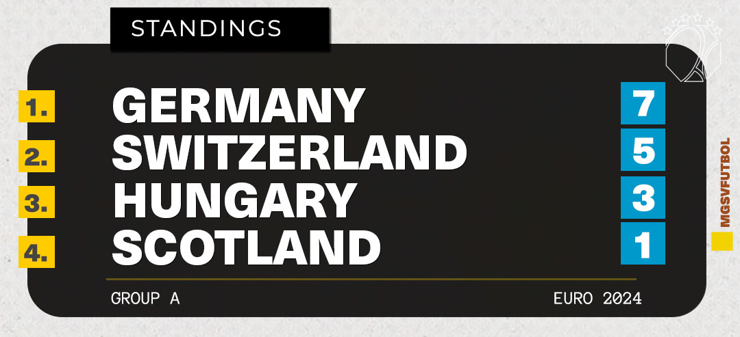 Switzerland took the lead in the 28th minute through a goal from Dan Ndoye and were looking to be on their way to a win over Germany that would have seen the Swiss win Group A. However, Niclas Fullkrug scored the equalizing goal in the second minute of the final added time (90+2), earning Germany a point that allowed them to stay unbeaten and win Group A.