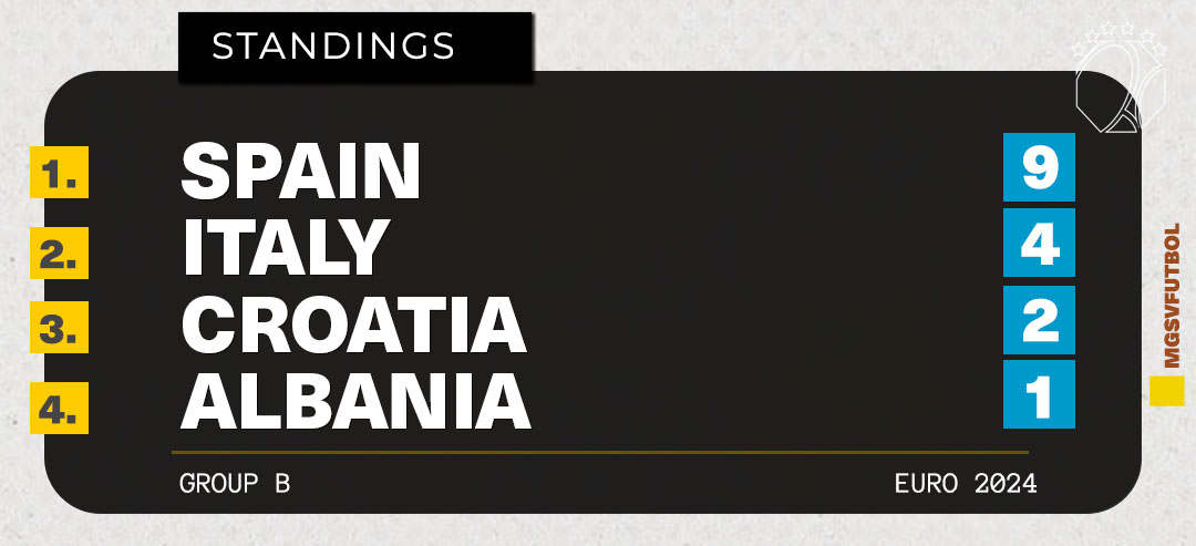 Spain won Group B with the maximum points, while Croatia’s hopes were dashed when they conceded late against Italy, losing their lead. Albania finished at the bottom of the group.