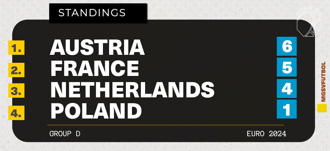 The Netherlands and France were in a position to secure direct advancement to the Round of 16, but Austria changed the standings with a win against the Dutch, while a Polish team that had already been eliminated took a point from France. Austria restored their lead on three occasions to secure a 3-2 win over the Netherlands to win Group D, while Poland came from behind to get a point in a 1-1 draw with France.