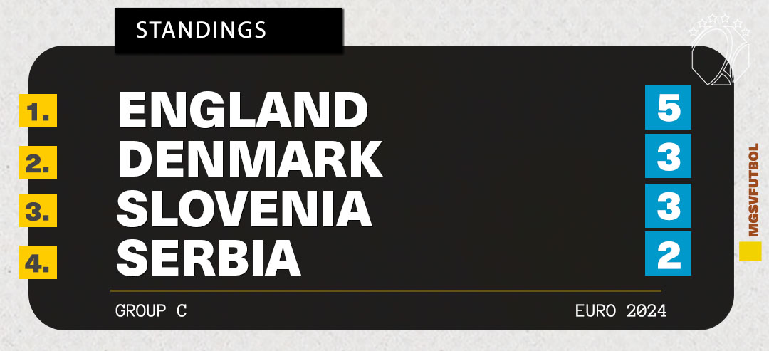 England and Denmark avoided defeat by playing out a goalless draw against each other. This worked to their advantage as Slovenia and Serbia also played out a goalless draw. The point gained by the Danish was enough to get them second place in the group, ahead of Slovenia, while Serbia finished at the bottom. England won Group C.