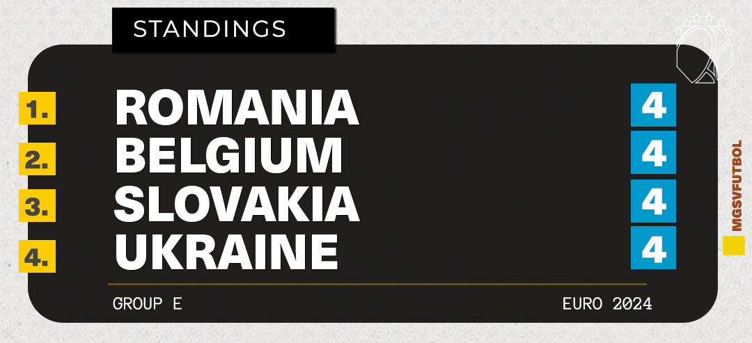 Goal advantage decided the standings in Group E after all four teams ended up with four points each, allowing Romania to come out as group winners, Belgium as runner-up, and Slovakia to advance with their third-place finish. Ukraine is eliminated.