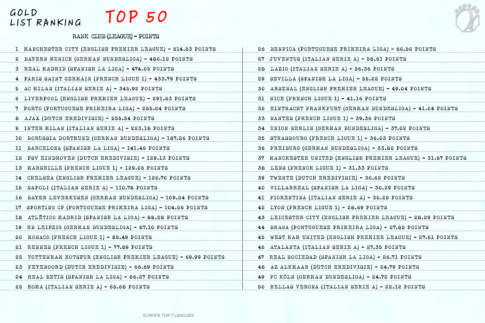 Manchester City dethroned Bayern Munich to finish this season at the top of the MGSVfutbol’s Gold List ranking.
