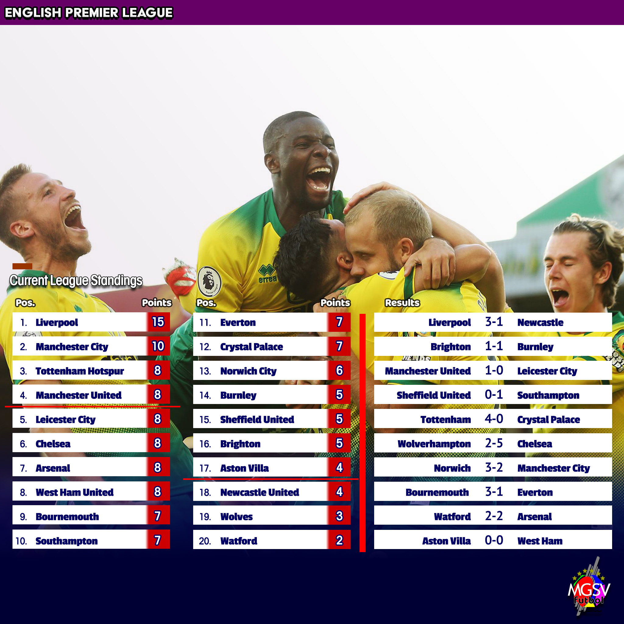 The shock of the round was newly-promoted Norwich City handing Manchester City their first defeat of the season. Norwich never trailed in the journey to a 3-2 home win against the defending champions. The result widens Liverpool’s lead at the top of the league standings to a 5 points after five matches played.