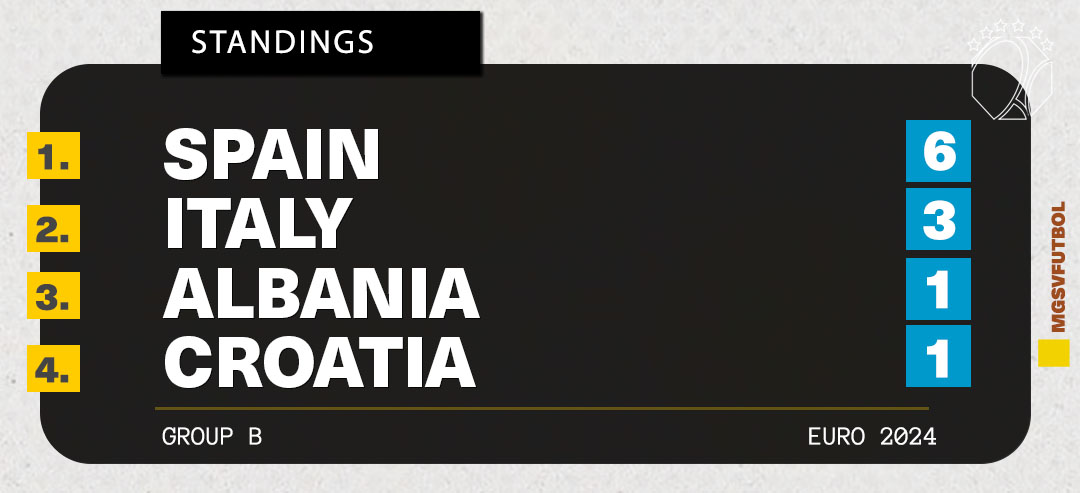 Group B concludes in the Euro: Italy looks for a win against Croatia to bounce back from their defeat against Spain. The Spanish team will be aiming to win the group unbeaten with maximum points by beating Albania. Both Albania and Croatia are still without a win.