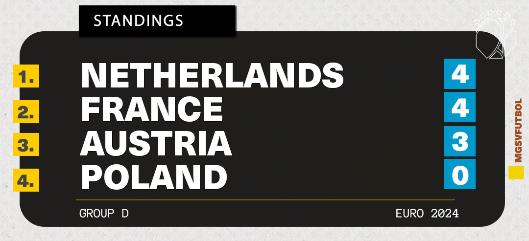 As things stand in Group D, the Netherlands and France are advancing directly to the Round of 16, but Austria can change that if they manage to win against the Dutch. Poland is out and will have nothing but pride on the line when they face a French side that will be looking for a win to ensure direct advancement to the knockout stage.