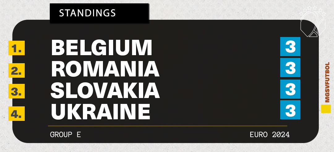 All four teams in Group E are on three points. Belgium takes on Ukraine, while Romania takes on Slovakia.