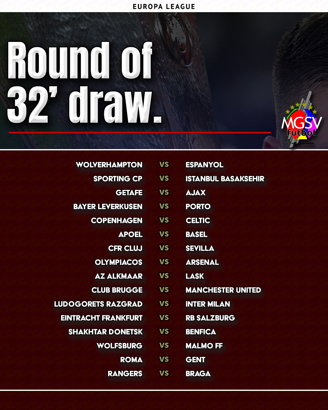 Ajax is paired with Getafe, RB Salzburg takes on Eintracht Frankfurt, Inter Milan will have to handle Ludogorets Razgrad, Bayer Leverkusen got Porto, Olympiacos is given Arsenal, and Club Brugge has to go through Manchester United