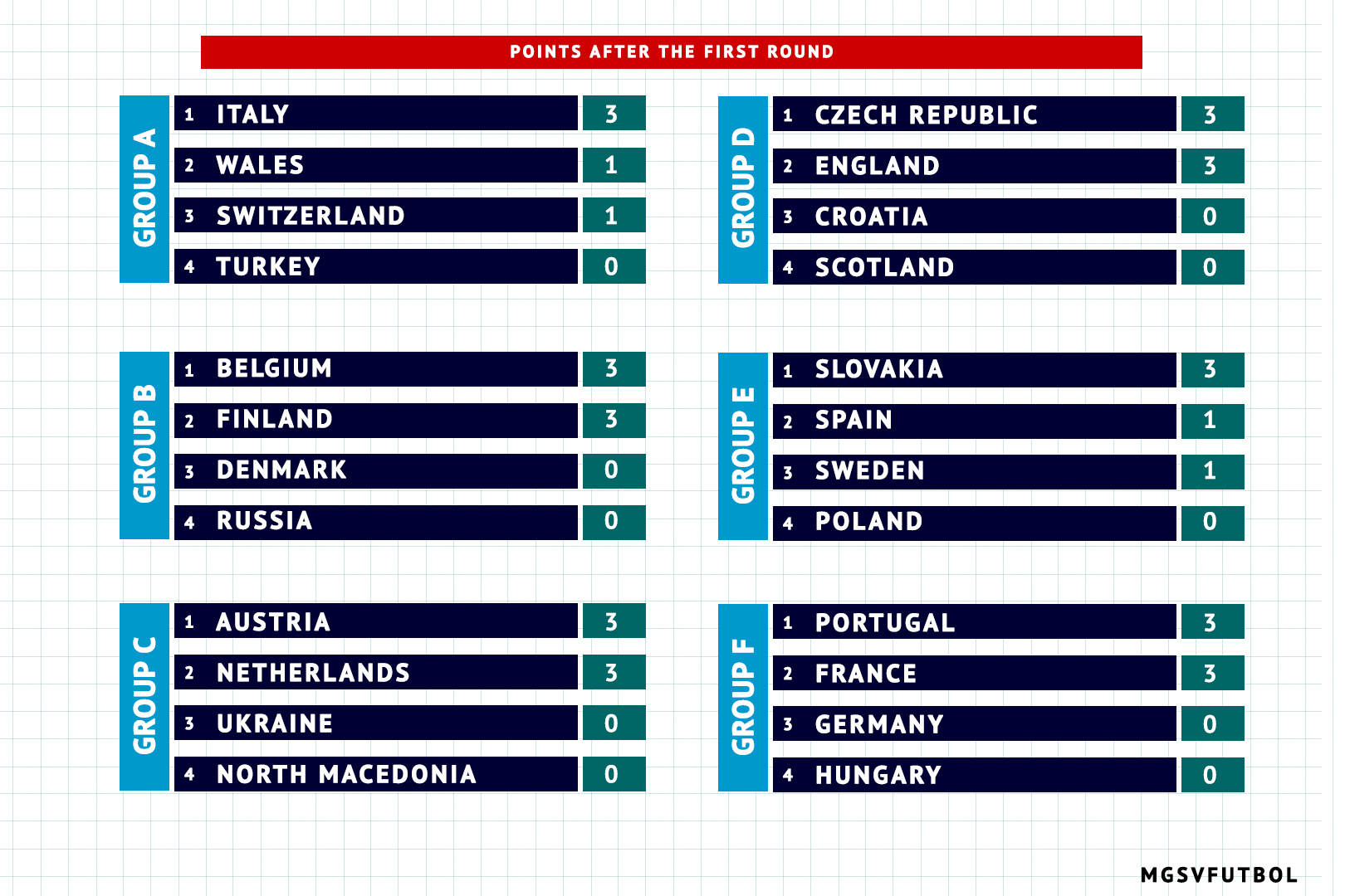 This is how things stands after the opening round of the 2020 Euros. Spain and Germany are without a win.